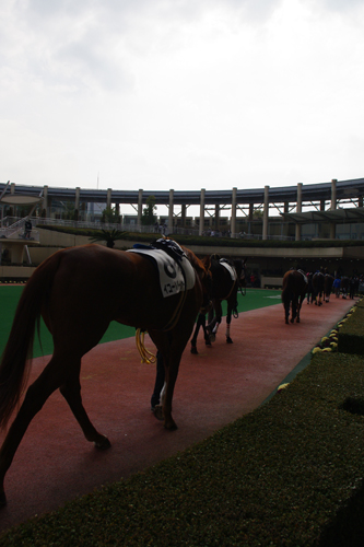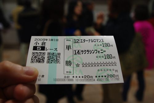 テンションあがってあがって♪ 天気もいいし、あったかいし。 よくわからないけど、 サイコーの競馬日和♪ (そーなのかな?) レース結果はというと 第5・・・ -200円 第6・・・ -400円 第7・・・ -500円+1,340円=+840円 第8・・・ カツカレー休み 第9・・・ -600円 第10・・・ -700円+650円=-50円 第11・・・ -800円 第12・・・ -1600円+1640円+4640円=+4680円 結果 +3470円 おお。プラスだよプラス。 最初は200円だったのに、 賭けって怖いわ。 そしてオレって怖いわ。 どんどん賭け金が増えてるもん。 たまたま最後に当たったからプラスになったけど、 これはずれたら、 給料日前のかなり痛い出費だった。 でも一回が 600円とかやったらあんま出費した気にならんのよねー とか思ってたんだけど、 気がつけば7レースもやってたんだねー・・ 最後はもう、いつ来るかわかんないし。とかで 200円ずつとか賭けちゃったし。 おかげで配当が倍になって元が取れたんだけどね。 いやいや、楽しい初競馬でした♪